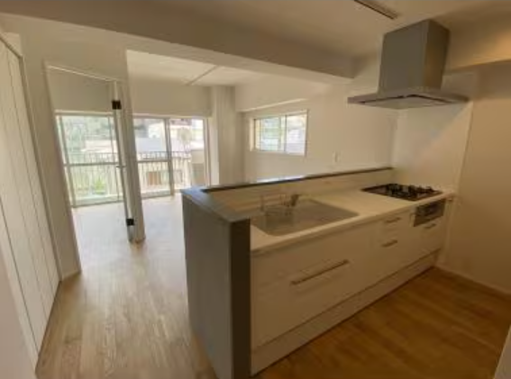 LDK横にある洋室の扉を 斜めに設置することで キッチンからの眺めと 動線の確保。 I型キッチンを使った 対面工事でよくある コンロ前の壁も無くし 最大限、圧迫感を無くしました。