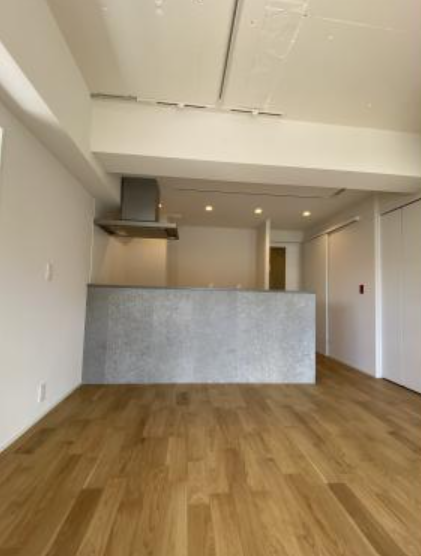家族構成上 2LDKを希望されており。 構造の壁もありリビングを広くとることが難しい中での 間取り変更となりました。 キッチンに立った時の視線を広げる為に コンロ前に壁が無い対面に さらにリビング横のお部屋からも明かりが届くように 入口扉を斜めに配置し、動線のストレスも軽減しました。